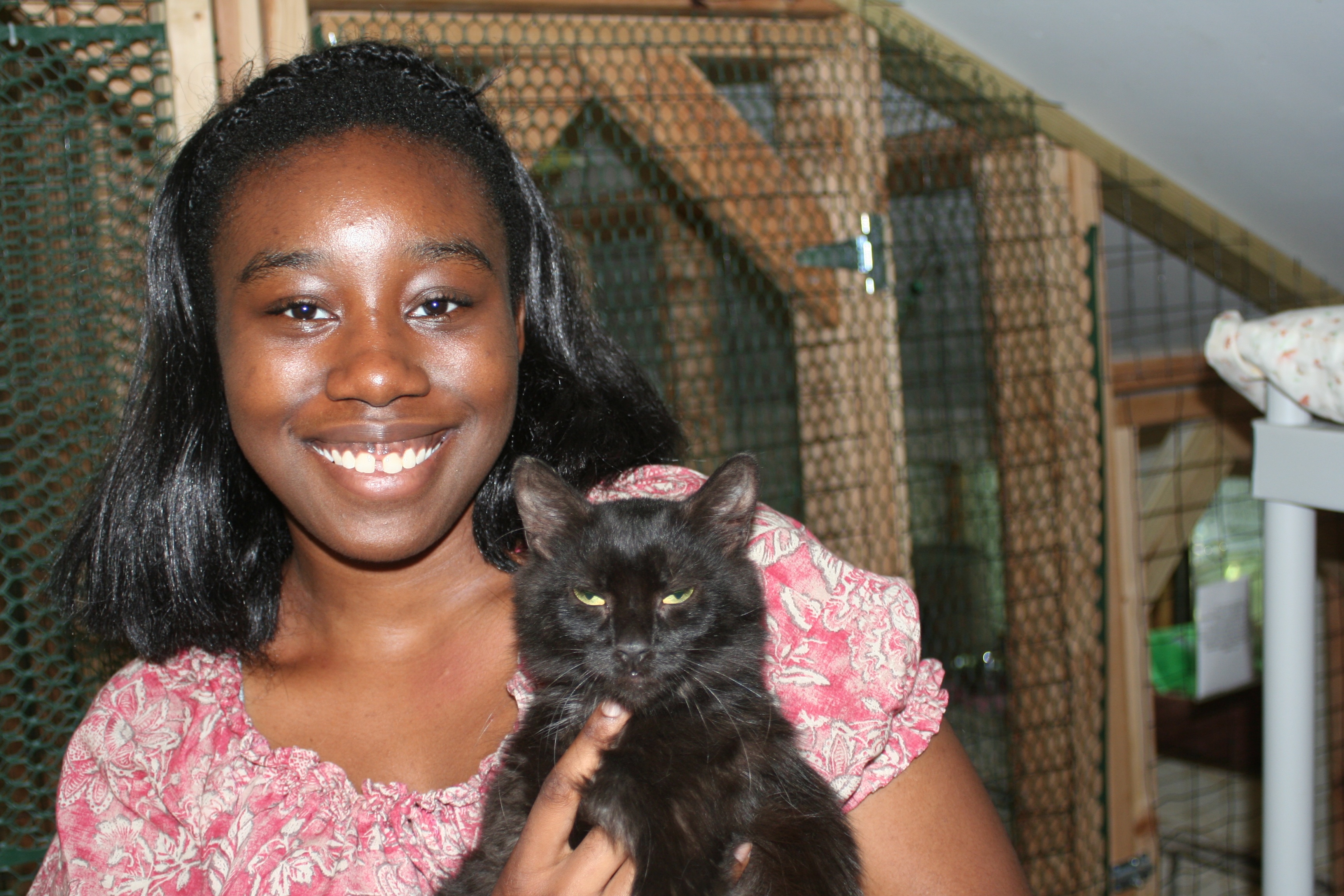 If cats could design their own shelter, I imagine it would be just like Mid Hudson Animal Aid, a non-profit no-kill sanctuary in Beacon, New York. Here cats are free to roam the house, filled with toys and climbing ramps, and can wander onto the porch to enjoy the fresh air. And if cats could choose a volunteer to care for them, it would be someone like Antinya Monroe, a gentle and soft-spoken 17-year-old, who has dedicated her time to the facility for the past 10 months.“I wish shelters like this existed in every city,” she said, sitting in a large and sunny room, surrounded by some of the 160 cats currently awaiting adoption. As she spoke about her work at the sanctuary, some of the cats came up to her for snuggles while others played with each other or lounged on pillows.Antinya started volunteering at Mid Hudson Animal Aid when one of her high school classes required that students complete 10 hours of community service. Long after the semester ended, she still spends Saturdays at the shelter, cleaning litter boxes, mopping floors, washing laundry and playing with the cats during her breaks.In addition to her cleaning duties, Antinya participates in the Feral Friends Program, which pairs volunteers with outdoor cats used to fending for themselves and unaccustomed to human contact. Volunteers socialize the cats by visiting them regularly and by giving them treats and lots of affection.Mid Hudson Animal Aid takes in cats with disabilities and chronic health problems routinely put down at other shelters. Antiya pointed out Ducky, a black cat born with a deformity that prevents him from being able to stand on his front legs. It doesn’t stop him from getting around or from playing with the other cats.Sarah is a beautiful tabby who was brought into the shelter after someone abused and blinded her. Despite her past, she loves people and can most often be found hanging out with the staff in the office.